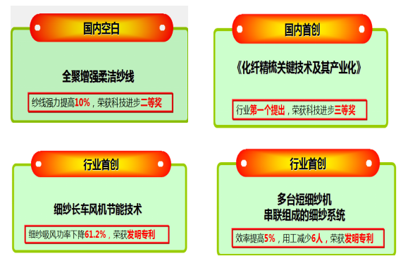 Med det innovative konseptet "ett skritt foran andre", ble den tekniske forskningsmodellen til "One Main, Two Links og Full-Staff Innovation" oppsummert og raffinert. Han ledet opprettelsen av National Textile Industry New Fiber Spinning Innovation Center, National Yarn Testing Center, National Knitting Yarn FoU og Production Base, Provincial Enterprise Technology Center, Provincial New Fiber Spinning Engineering Technology Research Center, Provincial Enterprise Graduate Workstation og annen FoU og innovasjonsplattform. Lag et provinsielt digitalt verksted for "high-end økologisk" blandet garn med 20 000 spindler, den innenlandske små-batch multi-variet Green Intelligent Production Line, gjennomfør 2 nasjonale Spark-programmer, 3 nasjonale fakkelprogrammer og 4 Jiangsu Provincial Key Technology Innovation Programs. 8 Prestasjoner vant Jiangsu Textile Technology Innovation Award, og vant 17 nasjonale autoriserte oppfinnelsespatenter og 10 bruksmodellpatenter. Selskapets kjerneteknologi har alltid vært i forkant av bransjen, og mange innovative prosjekter har vunnet i innenlandsk industri.