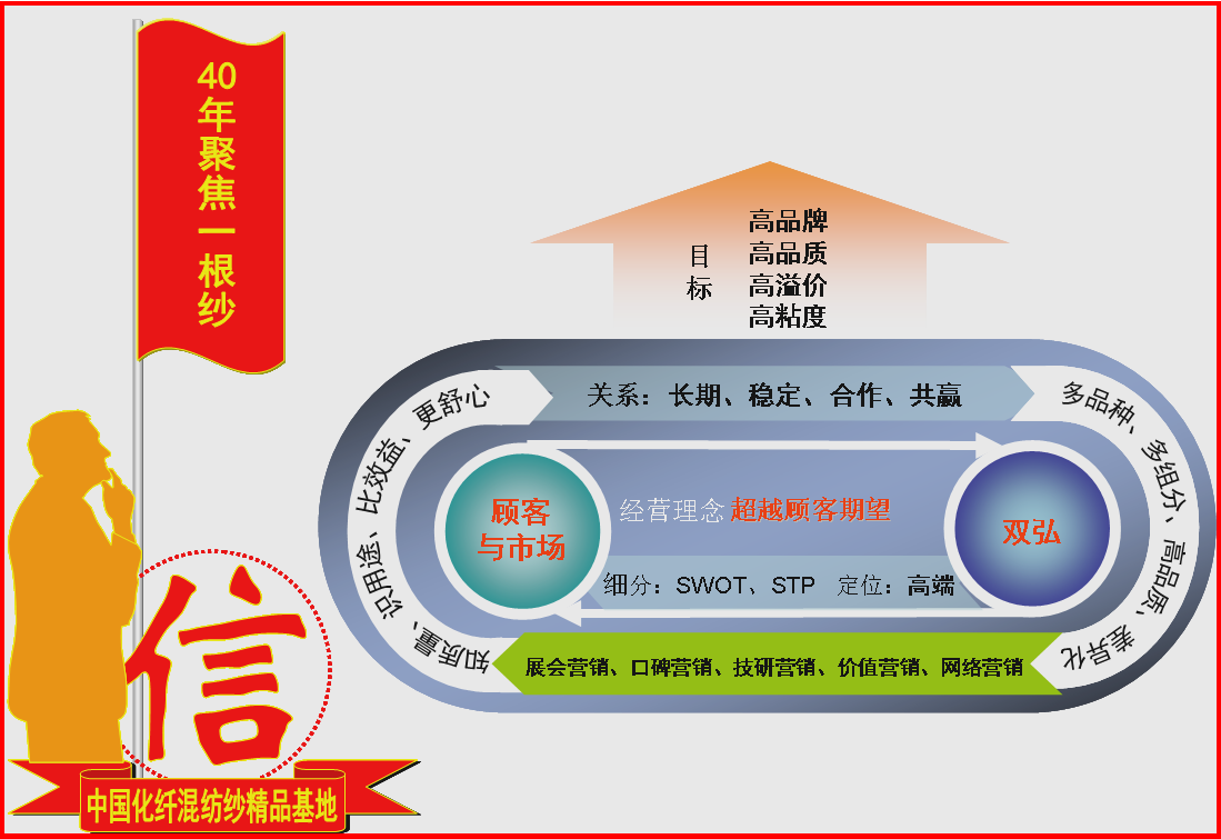 Å fokusere på kunder og forbedre merkevarer er de resolutte kravene og faste forfølgelsene til kameraten Ji Yijun i hans arbeid. Under sin talsmann har selskapet formulert forretningsfilosofien om å "bruke den strenge ledelsen, snurre kvalitetsgarnet og klatre på -endkundene", med "høy merke, høy kvalitet, høy premium og høy klistring" som mål, ved å bruke "SWOT, STP" og andre verktøy for å undersøke og segmentere markedet, hurtig i nøkkelgruppen, adoptere en "-utvikling". Markedsføring, markedsføring av mung Flott.