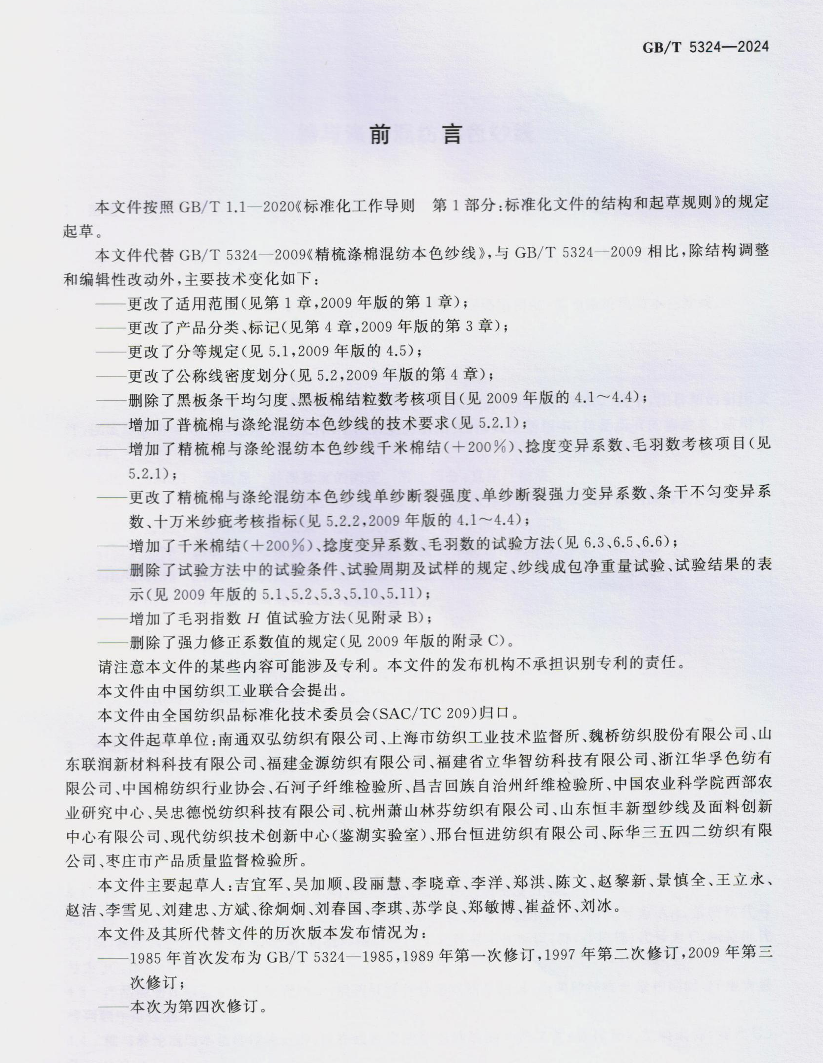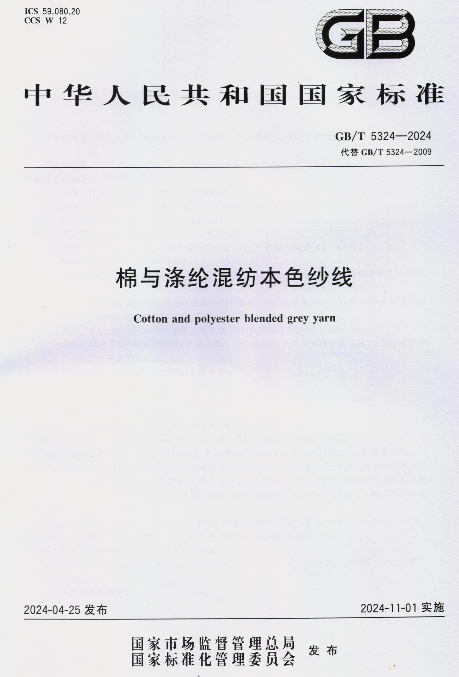 National Standard GB/T 5324-2024 "Bomull og polyester blandet naturlig garn" Utarbeidet av Dobbelt stort selskap vil bli offisielt implementert 1. november 2024.