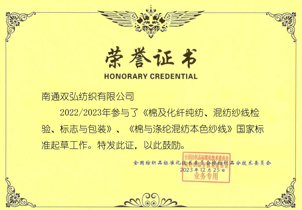 Som visesekretær for den nasjonale tekniske komiteen for standardisering av bomullstekstiler og En medlemsenhet i den tekniske komiteen for standardisering av China National Textile and Apparel Council, Double Great Company deltar aktivt i standardiseringsaktiviteter, deltar i formuleringen og revisjonen av Ulike standarder, tar initiativ å gjennomføre utarbeidelse og gjennomgang av standarder, og fremfører mange verdifulle meninger. Noen innovative forslag er blitt vedtatt og størknet, og blir hovedversjonen av Standard Drafting. Dobbelt stort selskap har suksessivt formulerte 3 nasjonale standarder, 11 bransjestandarder, 4 gruppestandarder og 3 Customs Processing Trade Unit Consumption Standards, og vant tittelen National Advanced Unit for Textile Industry standarder og Nasjonalt foretak med enestående bidrag til tekstilstandardisering.