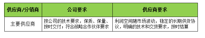 Selskapet legger spesiell vekt på forholdet til leverandører og har identifisert viktige leverandører og partnere. For å fremme langsiktig samarbeid, gjensidig forbedring og vinn-vinn-utvikling mellom de to partiene, utfører det hovedsakelig følgende aspekter.