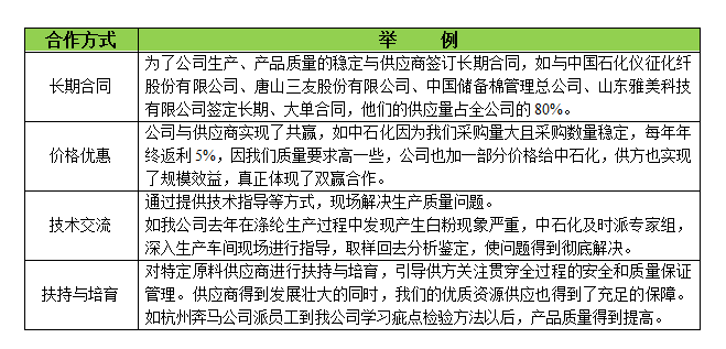 De viktigste leverandørene er: Sineopec Yizheng Chemical Fiber Co., Ltd., Tangshan Sanyou Co., Ltd., Xinjiang Production and Construction Corps No. 3 Agricultural Division Supply and Marketing Cotton and Linen Corporation, Shandong Yamei Technology Co., Ltd., etc., og deres tilbudskonto for 80% av selskapets totalt.