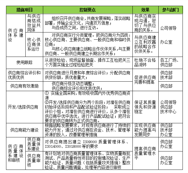 Bruke evaluering og insentivtiltak for leverandører for å fremme selvforbedring og kontinuerlig forbedring av leverandører; Introduser leverandørressurser av høy kvalitet gjennom leverandørutvikling og konstruksjon, forbedrer produksjonsskalaen og styringsnivået til eksisterende leverandører, reduserer anskaffelseskostnader og forbedrer konkurranseevnen til forsyningskjeden.